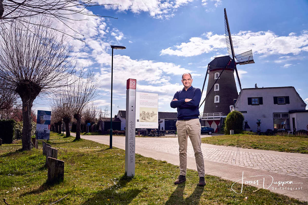 Frank van den Eijnden, directeur van gogh sites foundation, van gogh brabant gefotografeerd bij molen de vogelzang in Lieshout. Deze molen is door vincent van gogh getekend geweest. ( foto: Joost Duppen )
